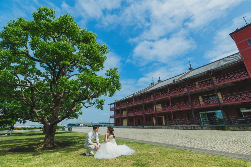赤レンガ倉庫をバックにお二人で仲良くお話ししているショット!! とても晴天でロケーション撮影日和でした♡