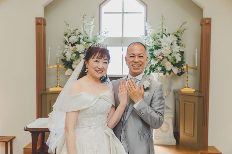 お二人に指輪を見せていただきました。教会でこのポーズをやると相性が良くて素敵です。