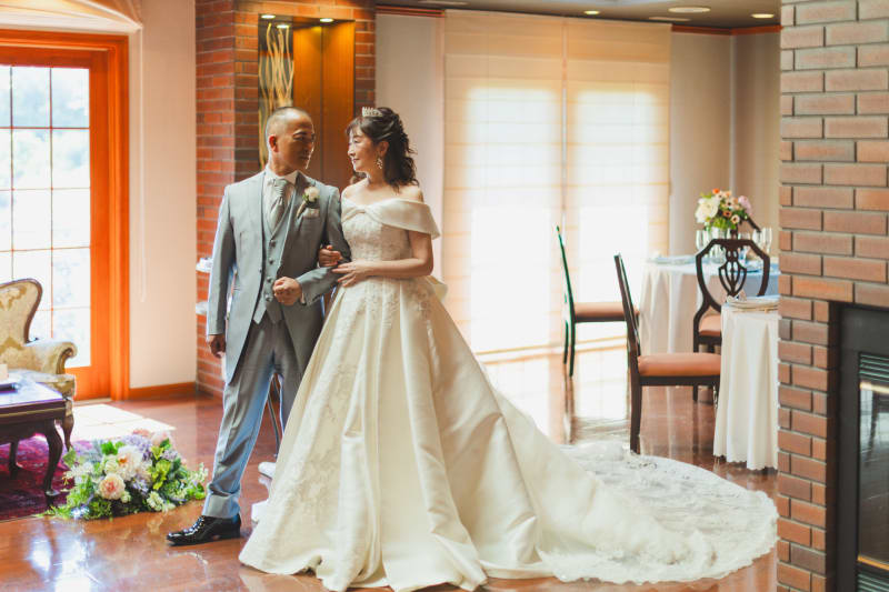 新郎様が手を取ってエスコートする姿がまるで映画のワンシーンのようです。