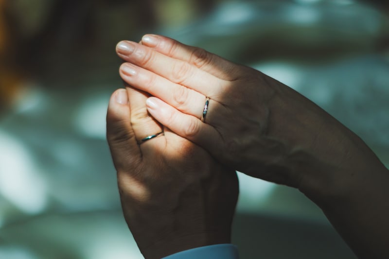左手を重ね合う二人。指輪のところだけ光が当たってドラマチックです!