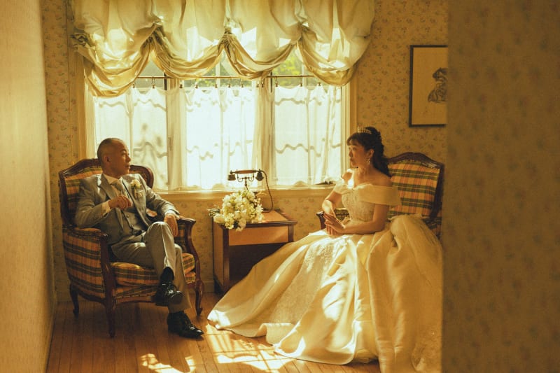 タキシードとドレス身を包むお二人ですがのいつも通りの雰囲気でお話しているようで素敵です!