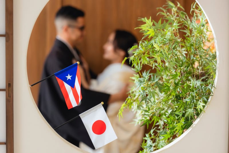 丸窓の間からお二人と紫陽花など色とりどりに!スタジオならではの幅広く様々な写真を撮ることができます!