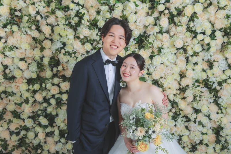 初めは壁一面に白い薔薇の背景で!ここで撮るとゼクシィの表紙のようなお写真が出来上がります!