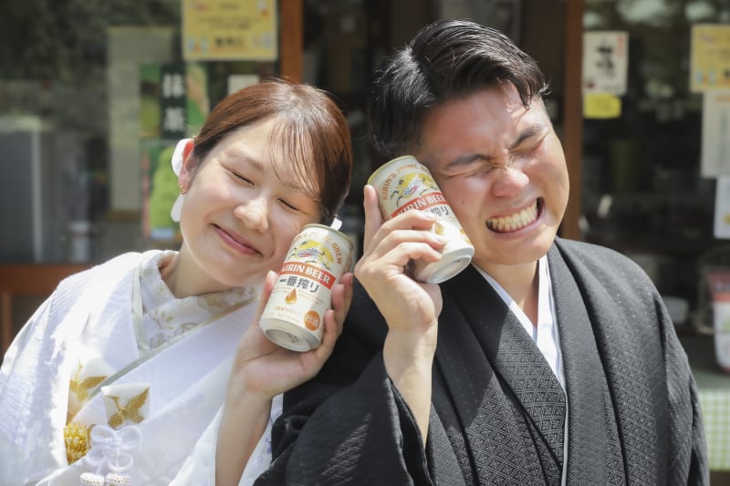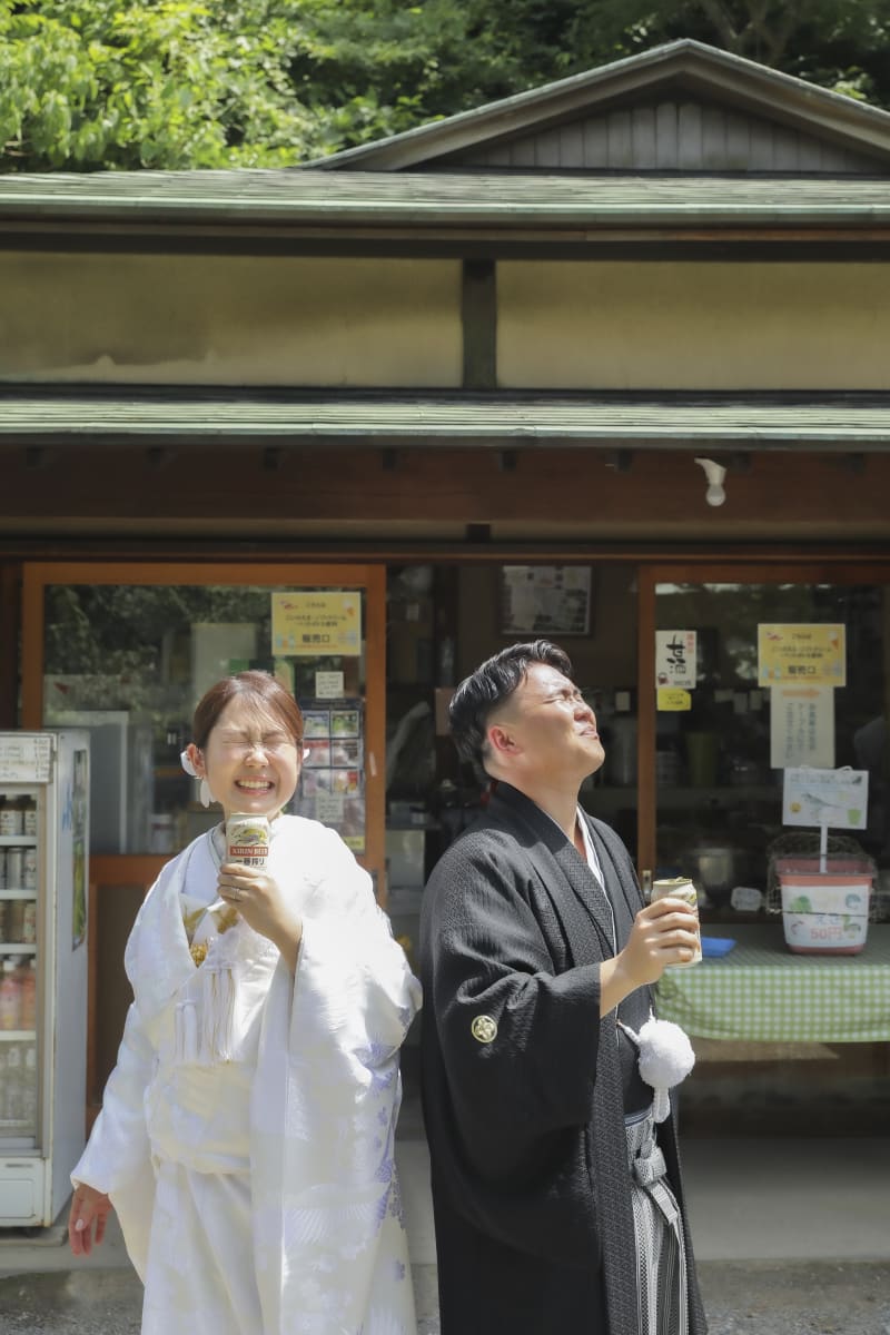 初夏の爽やかな緑に純白の白無垢が映えます。笑顔が素敵です。