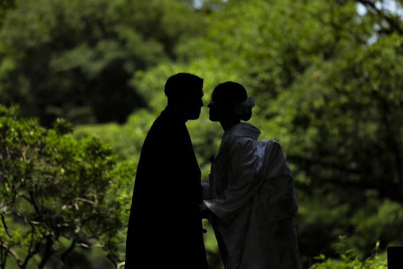 初夏の強い日差しを新郎様が和傘をさして防いでくれます。