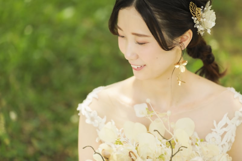 爽やかな新婦様の笑顔が緑の芝生を背景によく映えました。