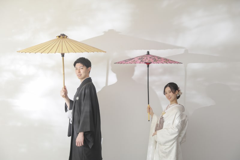 木漏れ日の中で和傘をさすお二人。新婦様のピンクの傘が可愛い。