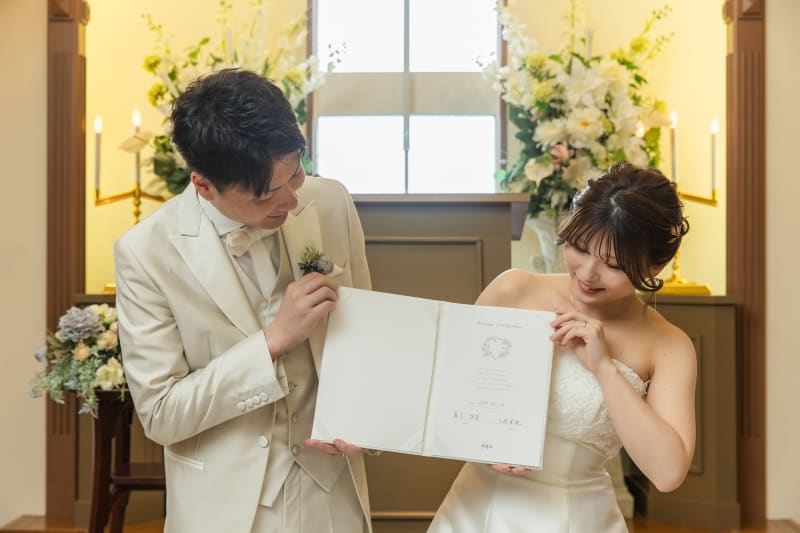 署名するお二人です! 本物の結婚式のようなお写真が撮れます!