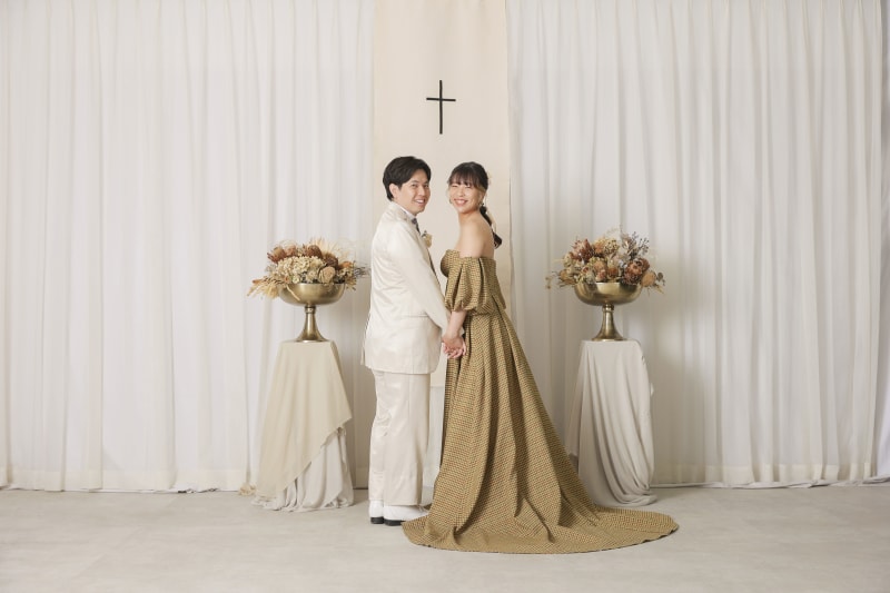 カラードレスはチャペル風の背景で