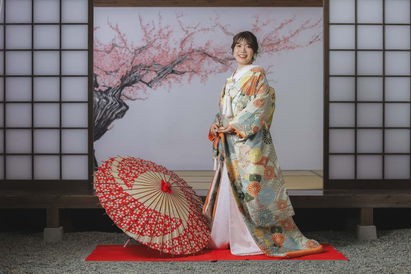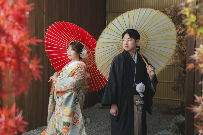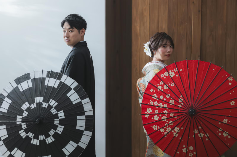 お二人のお着物の色に合わせてバイカラーで撮影しました!! 和傘もお着物によくお似合いですね!!