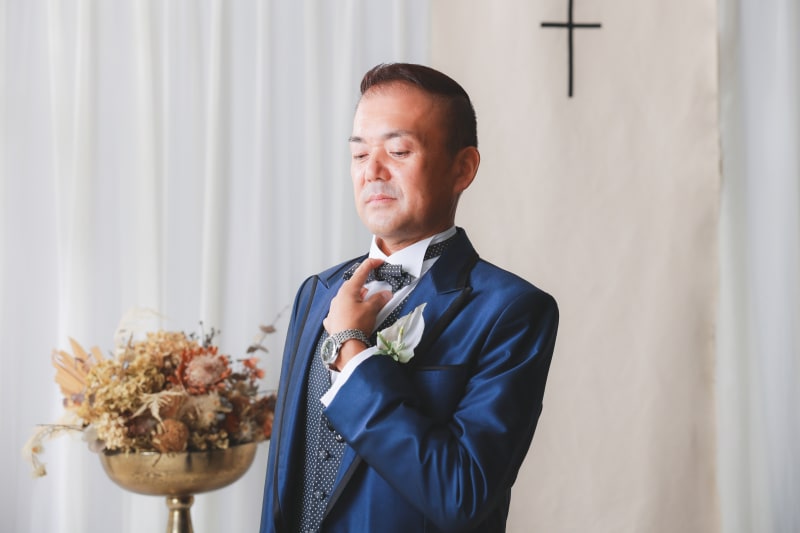 新郎様はかっこよく、蝶ネクタイを触っている感じです! 水玉のタキシードがおしゃれですね