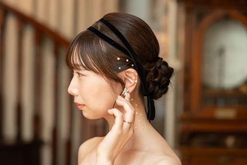 黒いリボンもおしゃれだけど耳元から首元へかけてのパールが可愛い!!