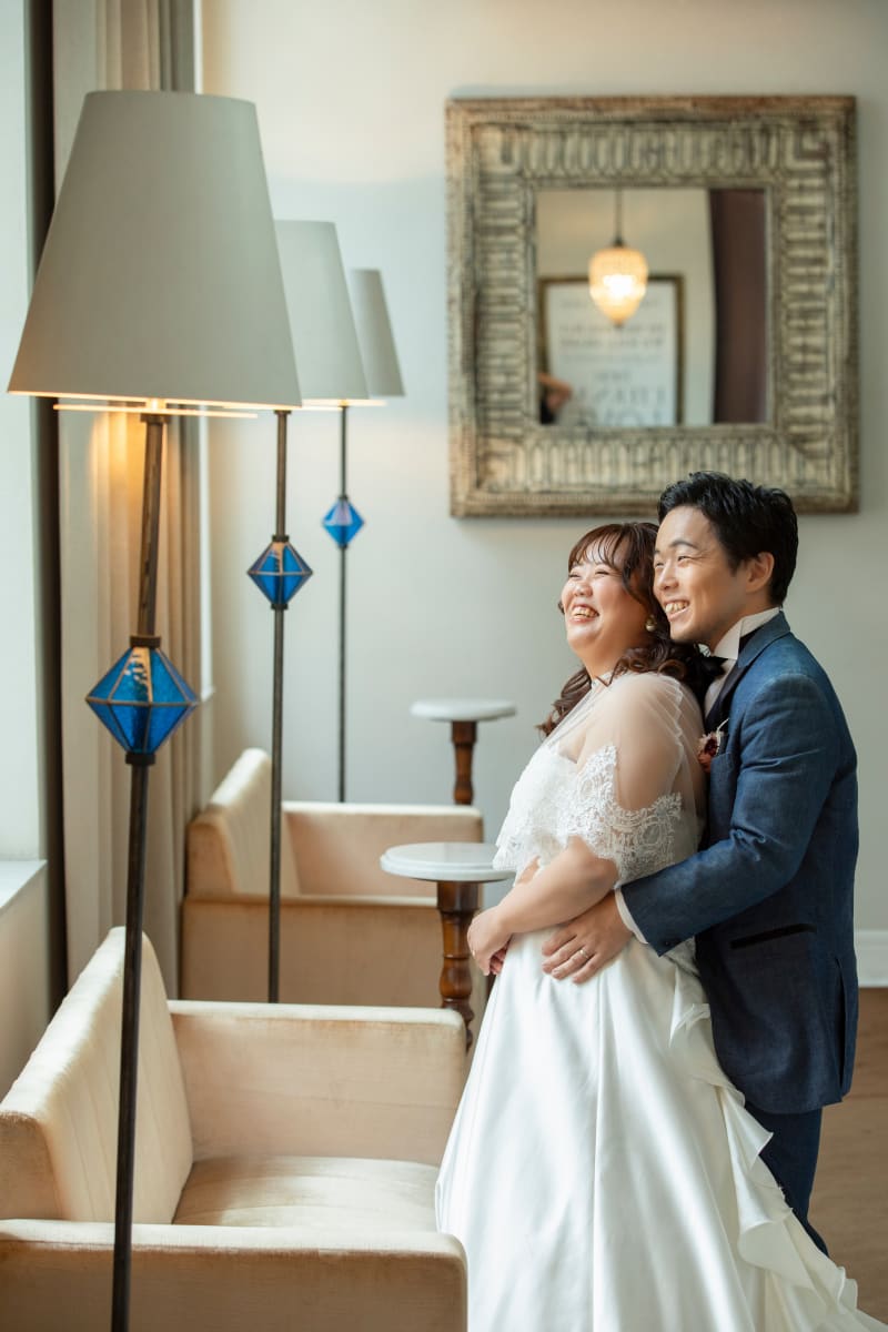 新婦様はソファで新郎様は壁に腰をかけておしゃれなお写真ですね
