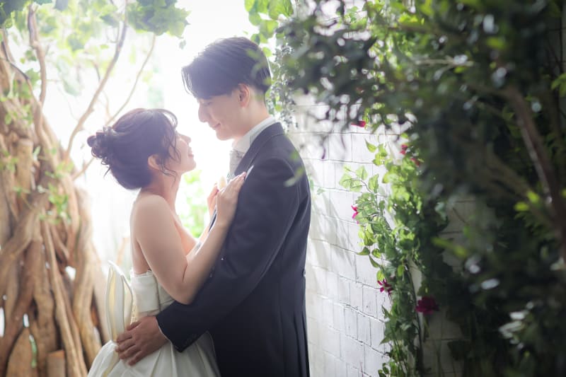 一面お花の壁が登場! 横浜みなとみらい店スタジオで撮影するこだわりのウェディングフォト