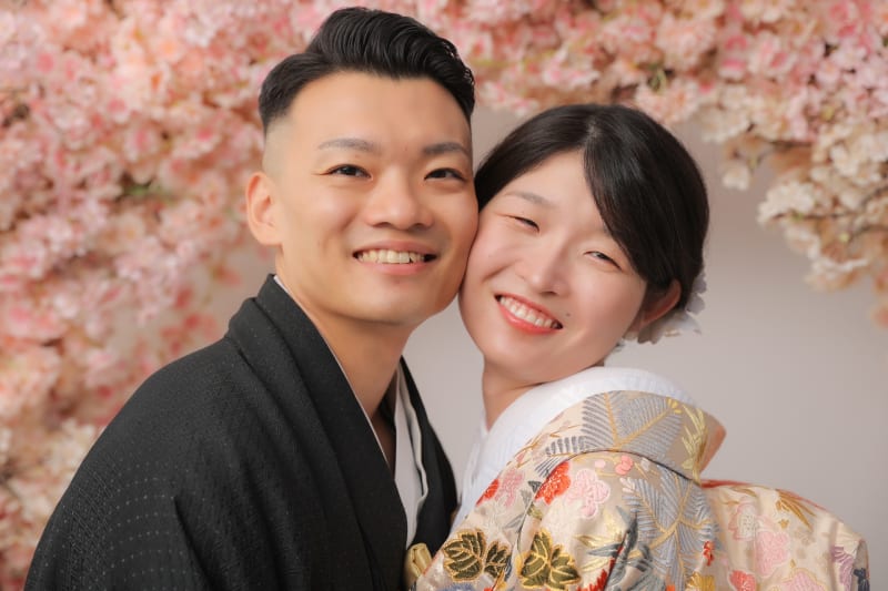 まずは柔らかい色味がかわいい桜色の背景から^^ ぎゅっと寄り添ったお二人の笑顔が素敵です!