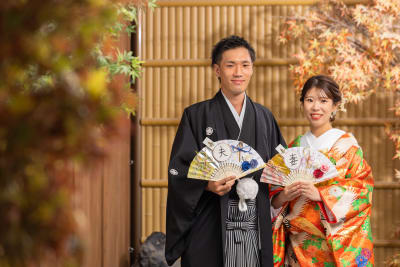 屋内庭園スタジオでは、立ち姿や正座はもちろん、お二人のお持ち込みのアイテムを使っての撮影もさせていただきました!