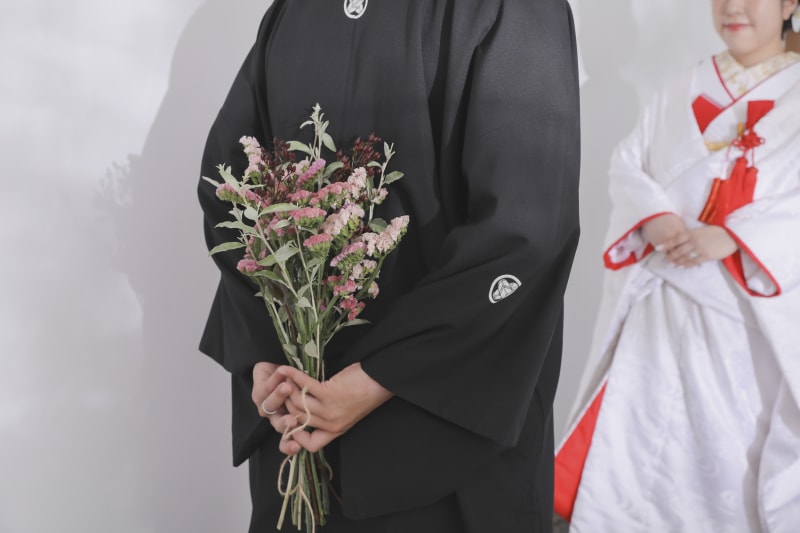 新郎様が花束を隠しているようなシーンを撮影しました!