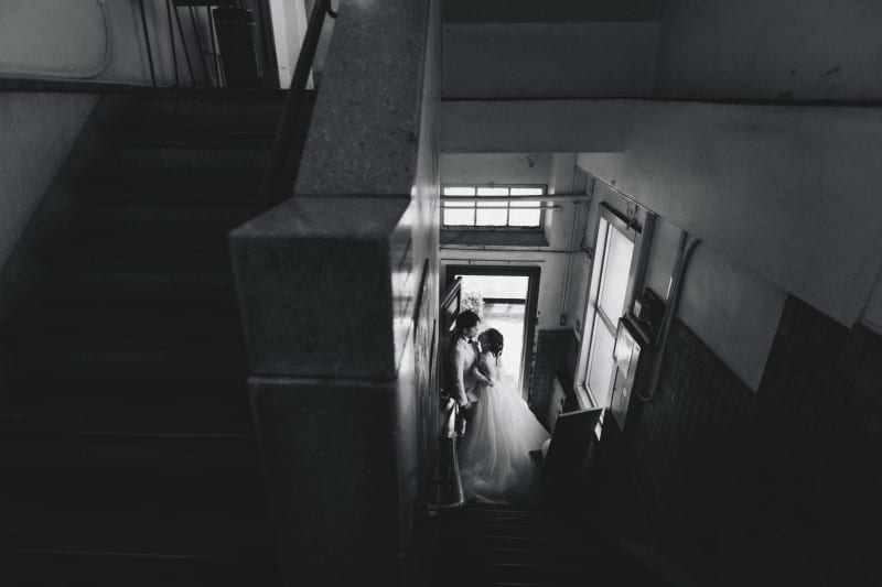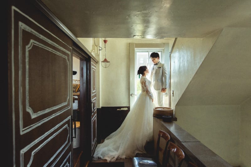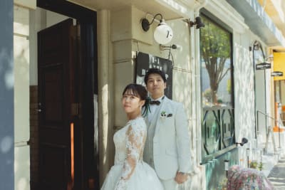 撮影当日は、花嫁様が純白の美しいドレスを身にまとい、花婿様がかっこいいタキシードでご登場。