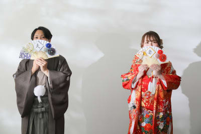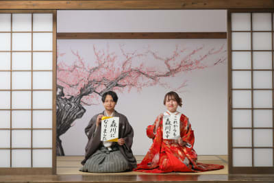 撮影には、様々な小物も持参してくださり、特にお二人が自ら用意された習字は、新たな思い出を深めるアクセントとなりました。撮影序盤からとてもリラックスしており、仲むつまじい雰囲気が撮影を一層楽しいものにしてくれました。また、新婦様の可愛らしい髪型も和装にぴったりで、その美しさにスタッフ一同思わず感嘆しました。