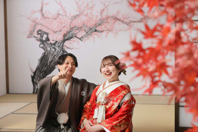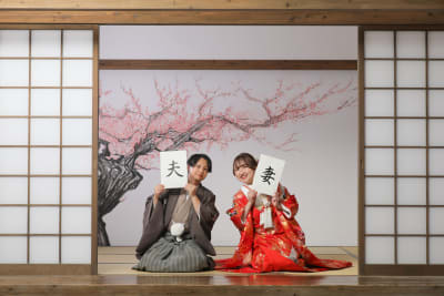 先日、当スタジオにて素敵なカップルの和装ウェディングフォトを撮影させていただきました。今回のお二人は、屋内庭園スタジオを舞台に、赤の色打掛と茶色の紋服袴という伝統的かつ華やかな装いでご登場されました。