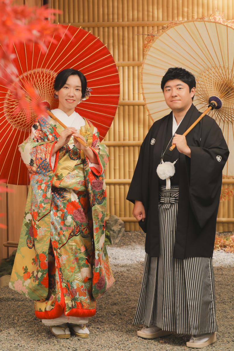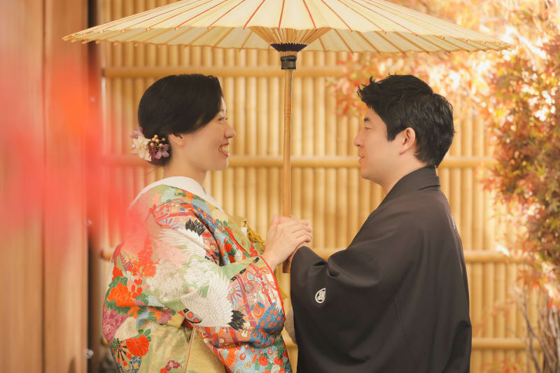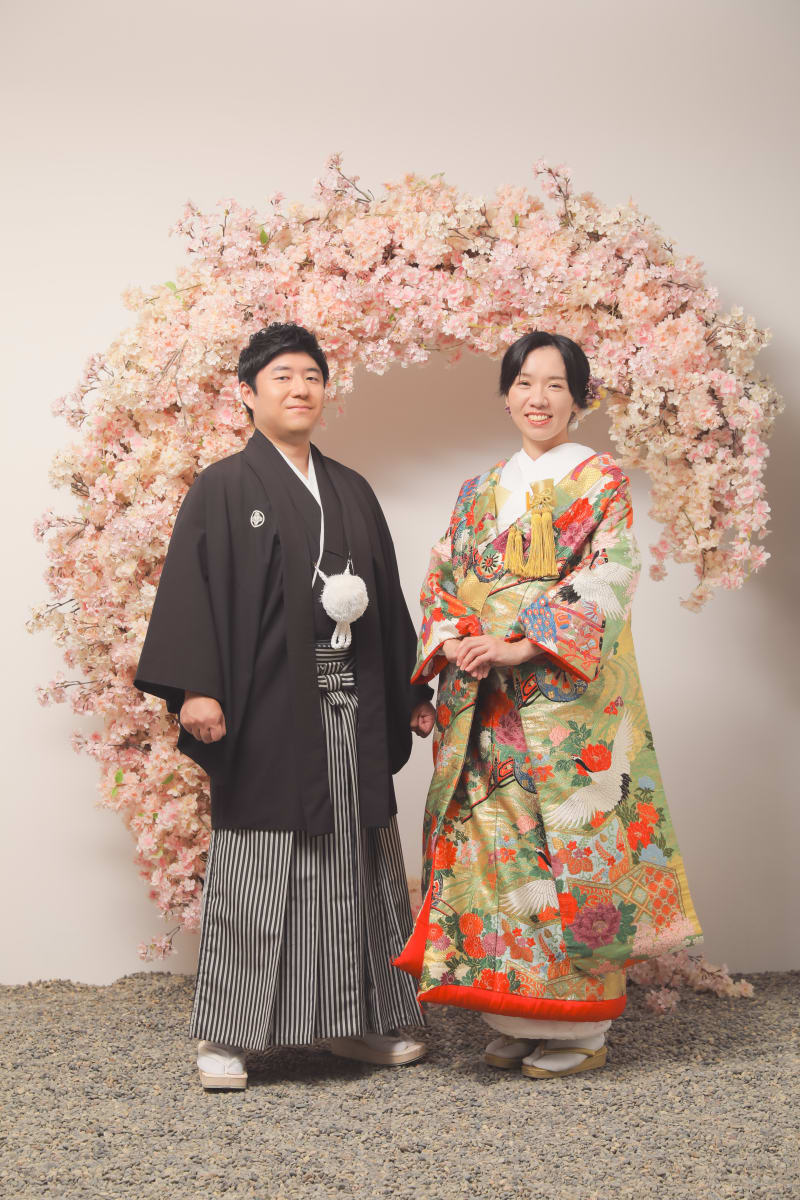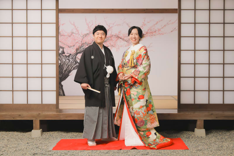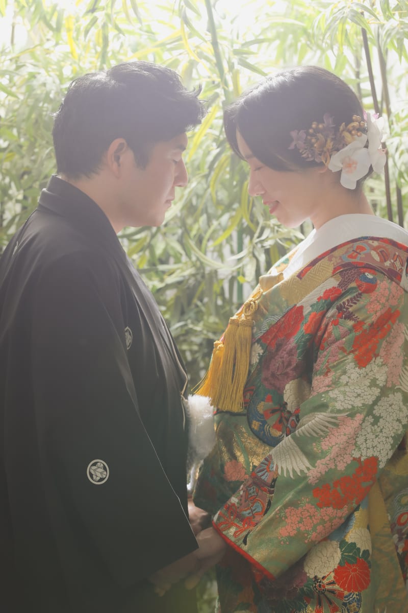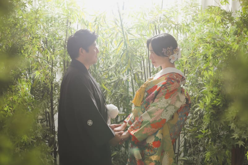 お二人は和装の色打掛を選ばれ、屋内庭園にて和の雰囲気で撮影しました。