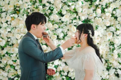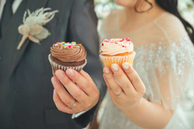 次に、洋装撮影は当スタジオで行いました。スタジオでは、お二人の持参されたカップケーキや風船といった可愛らしいアイテムを取り入れ、ポップで楽しい雰囲気の写真が撮れました。新婦のふんわりとしたドレスと、新郎のスタイリッシュな姿も相まって、こちらではまた違ったお二人の素顔を写し出すことができました。