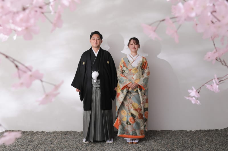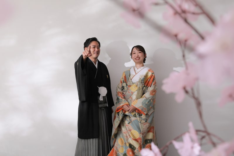 和装はまず、白背景に桜の木を置いて華やかに! 最初は少し緊張気味の可愛いお二人です!