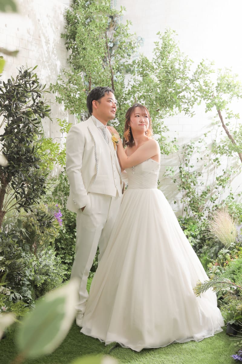 緑いっぱいのガーデンに白のお二人の衣装が映えますね! 目線を上げてカッコよく!