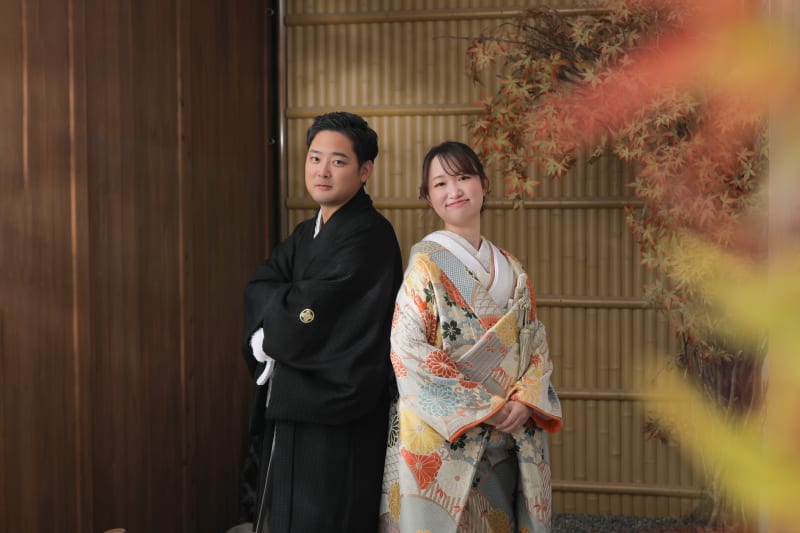 秋の背景で背中合わせになって撮影! スタジオだと様々な季節で撮影できます!