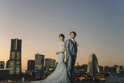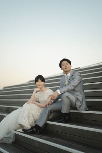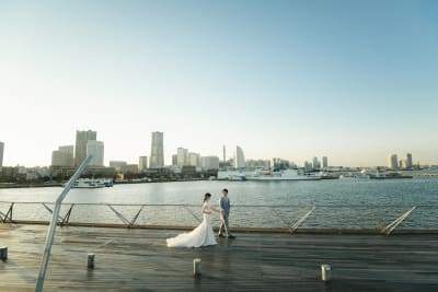 夕方には、美しい夕日が大桟橋をオレンジ色に染め、二人のシルエットが一層引き立ちました。この時間帯の撮影は特にロマンティックで、まるで映画のワンシーンのよう。横浜の広がる景色とともに、二人の笑顔が印象的な素晴らしい写真を残すことができました。
