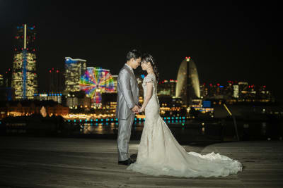 夜景が始まると、横浜の煌めく街並みが背景に。そんな中でもお二人は自然体で、照れた笑顔がより一層輝きを増していました。この特別な瞬間をカメラに収めることができて、本当に嬉しかったです。