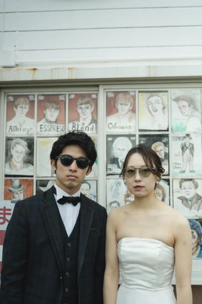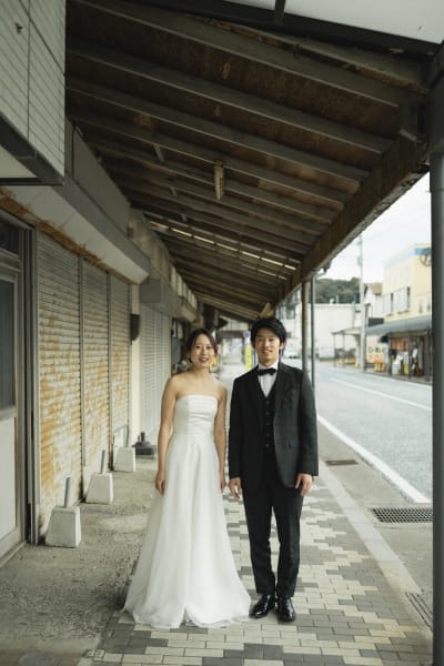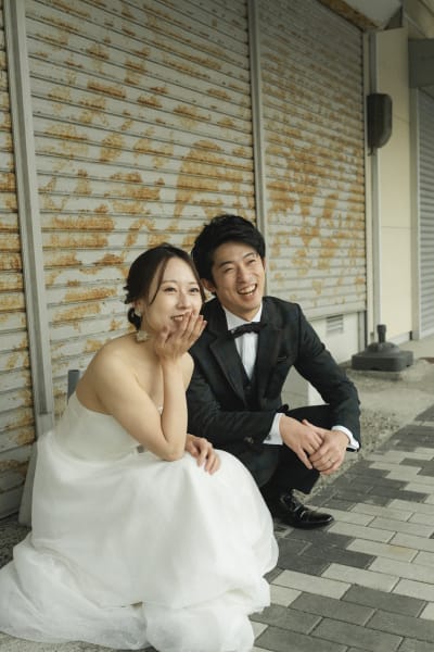 そして、城ヶ島から少し足を伸ばして下町の雰囲気が漂うロケーションでも撮影を行いました。レトロな街並みに佇むお二人は、まるで映画のワンシーンのようでした。二人の好みの色味を生かしたレトロな雰囲気で、思い出に残る1枚を撮影することができました。