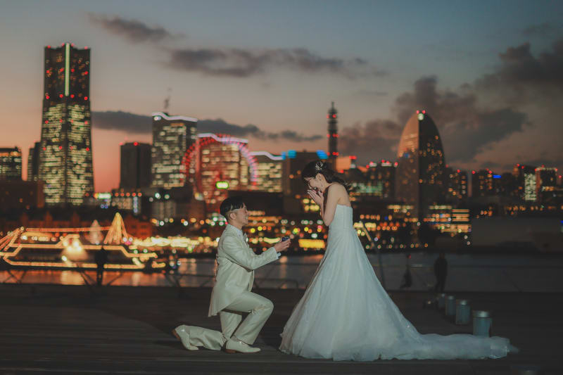 大桟橋から見える夜景でお二人のドレスとタキシードがより輝いていました!