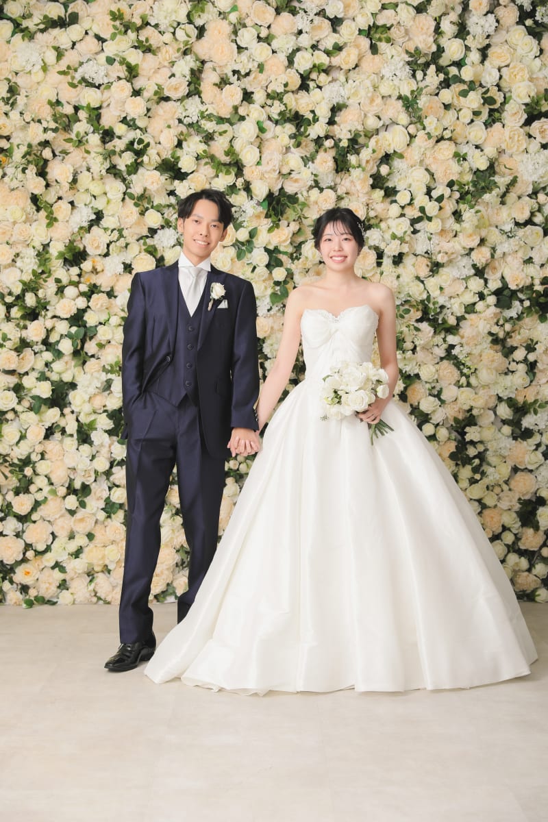 最初はフラワーウォールから!手を繋いで笑顔でとっても素敵です!