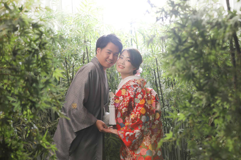 竹林で緑いっぱいの自然の中にいるようなお写真! ほっぺをくっつけて可愛いですね!