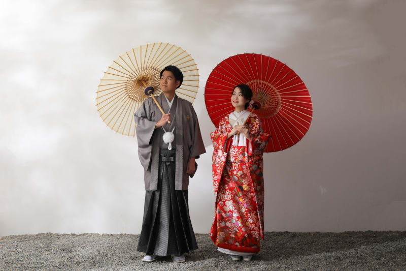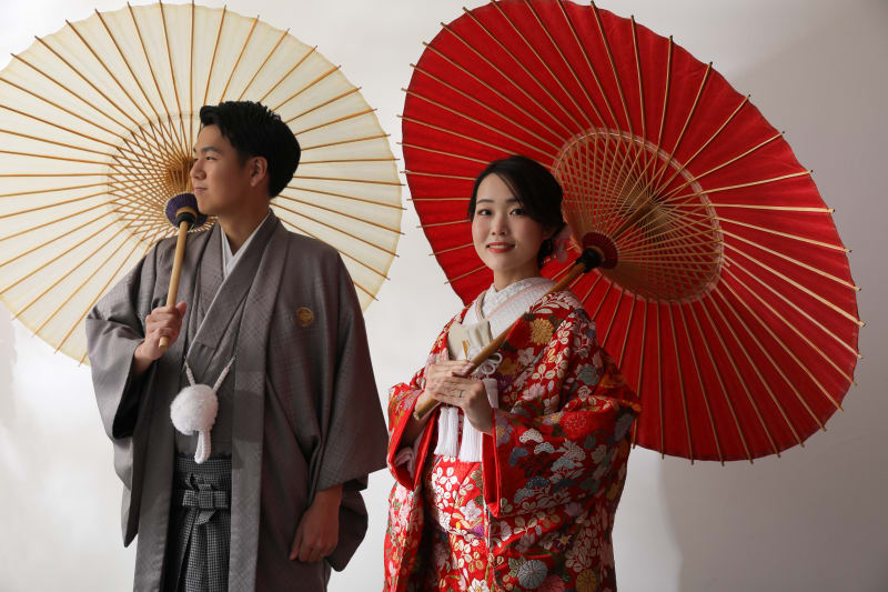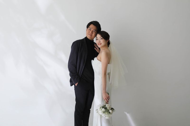 白壁で撮影! 白壁はお二人の衣装がとても映えますね