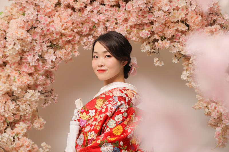 新婦様は可愛くピンクのお花の背景で撮影! 横顔も綺麗ですね!