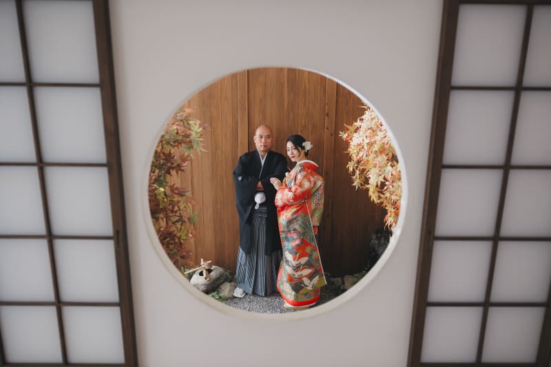 撮影はまず、和装屋内庭園での赤い色打掛の撮影からスタートしました。深い赤で彩られた色打掛は、和の美しさを引き立て、新婦様の凛とした佇まいをさらに魅力的に見せてくれました。庭園の落ち着いた雰囲気が、お二人の優雅で静かな雰囲気と絶妙にマッチし、自然と笑顔があふれました^^