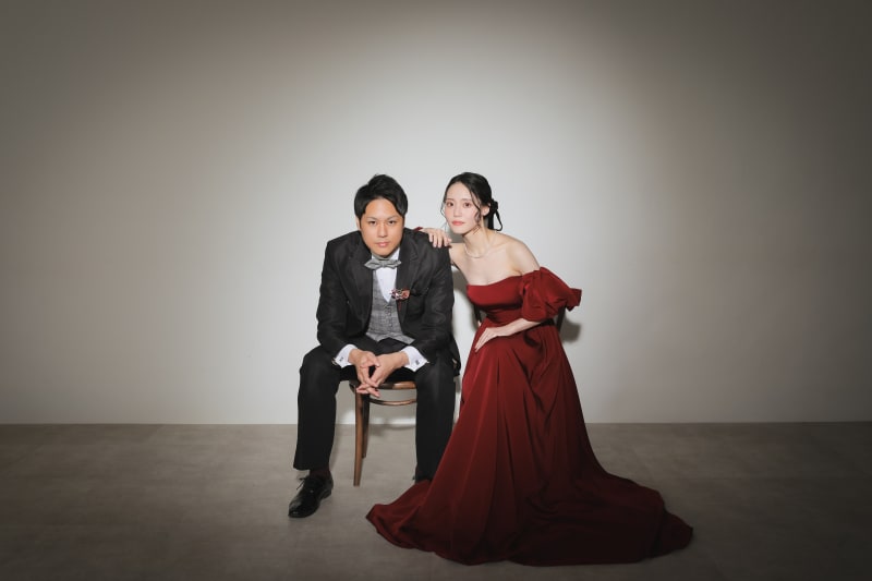 お次はカラードレスで。雰囲気をガラリと変えてかっこよく撮影いたしました。