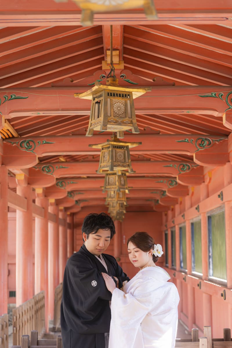 寄り添ってすこし落ち着いた雰囲気で。朱色に白無垢がとっても映えていますよね!