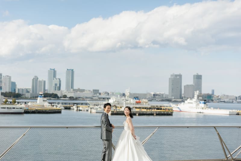 【横浜で記念日】汽笛が二人のスタートを祝う横浜のロケーションで美しい一枚を