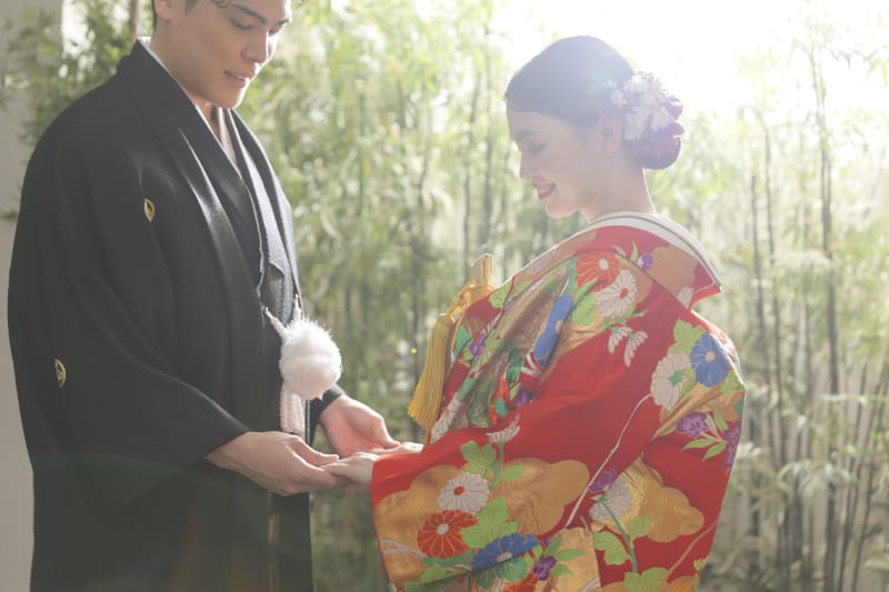 竹林の背景へ! 赤の色打掛、新郎様の黒紋付も合いますね! お二人とも本当にお上手でした^^