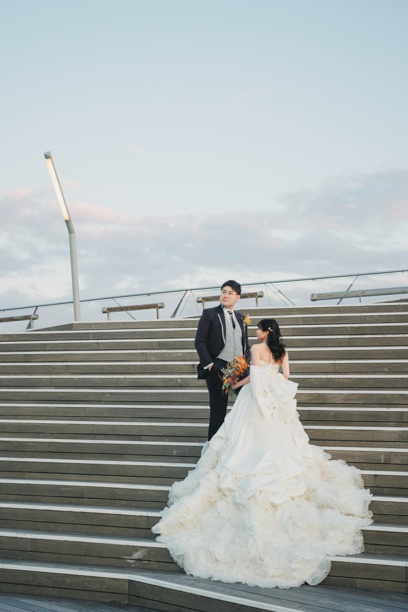 ドレスを広げ、新婦様の後ろ姿と新郎様もクールなポーズで!!