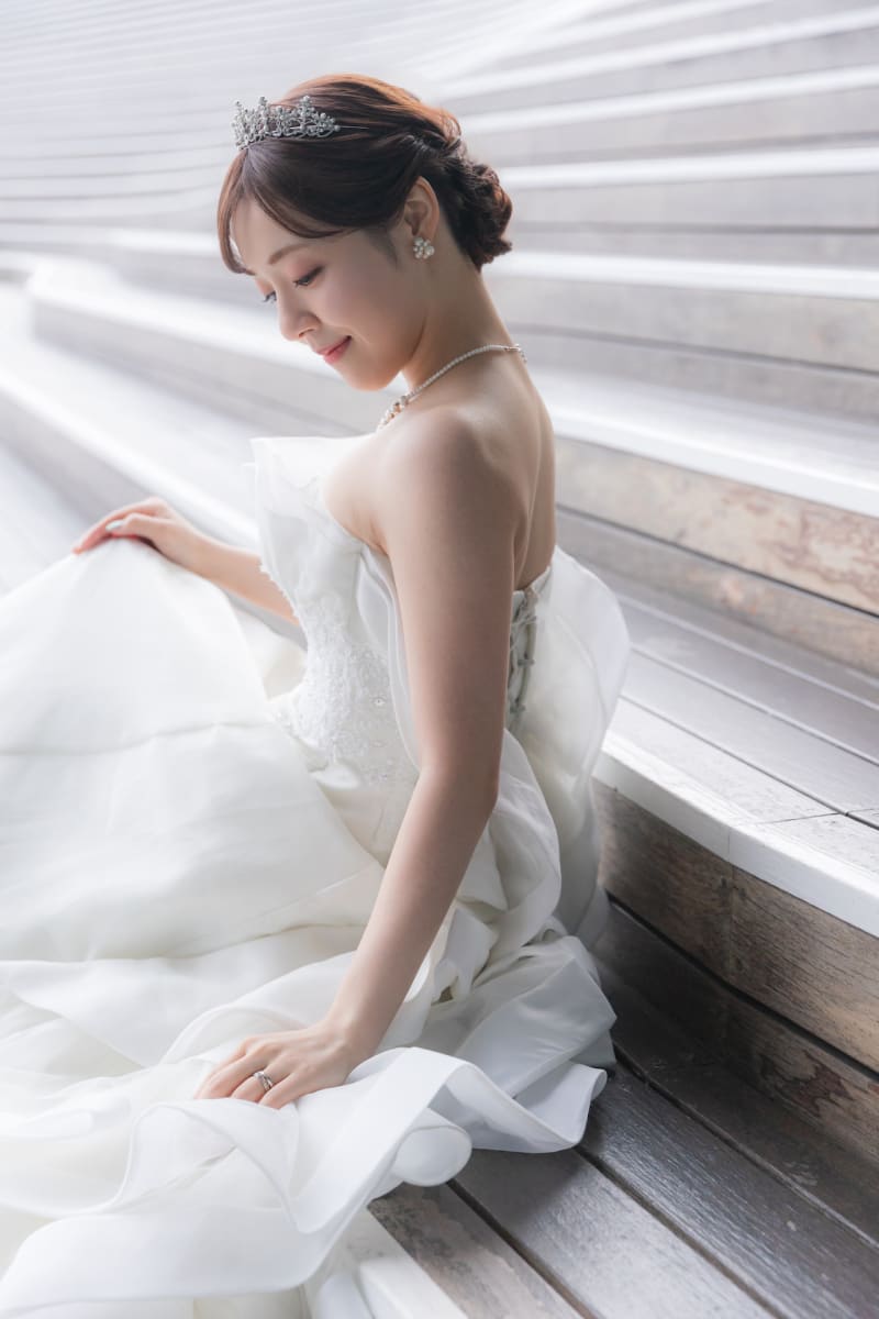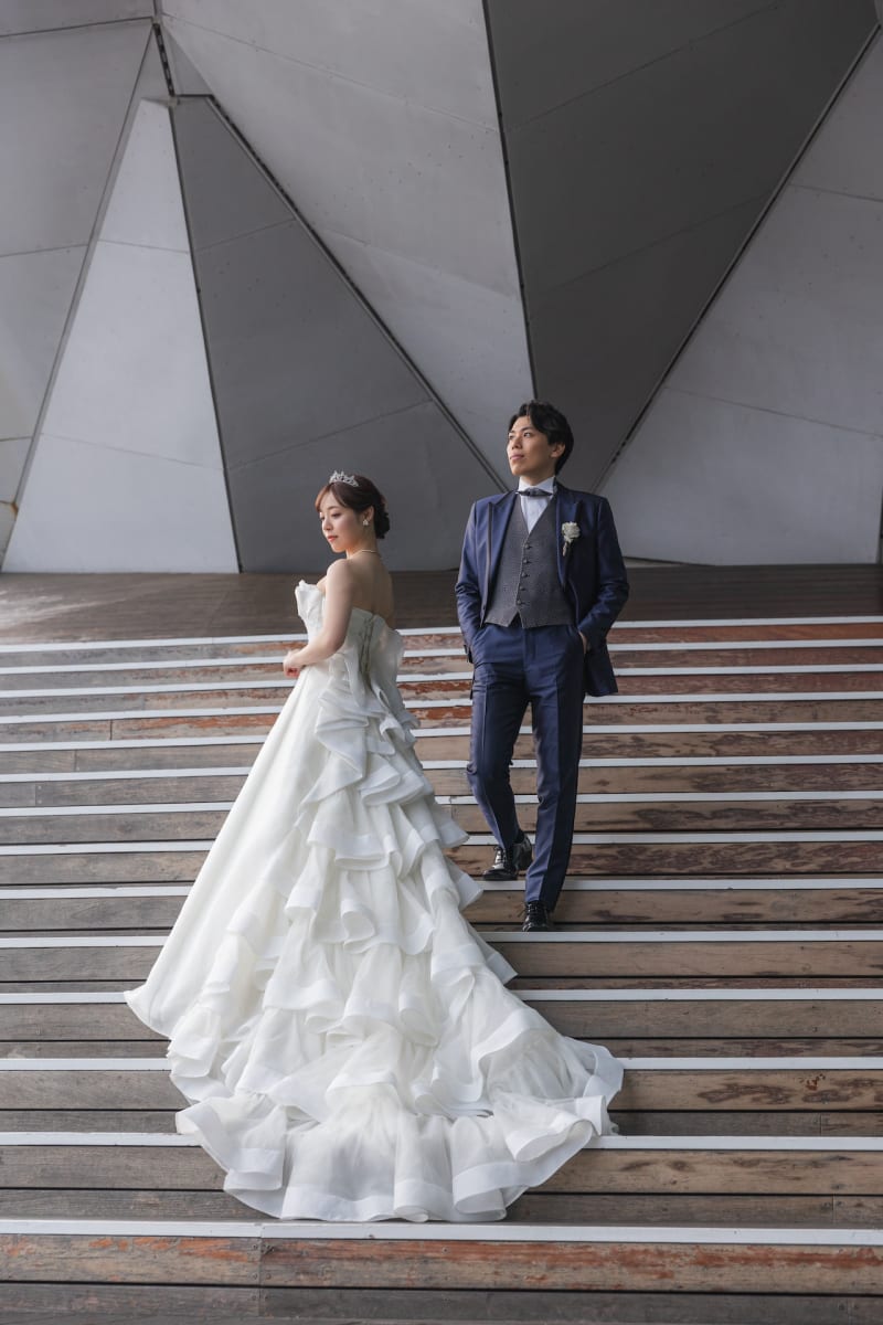 今回の撮影では、新婦様は大きめのフリルのドレスやティアラを身につけ、新郎様はかっちり決まったタキシードを纏い、お二人の華やかさに大桟橋の景色も華を添えてくれました。
