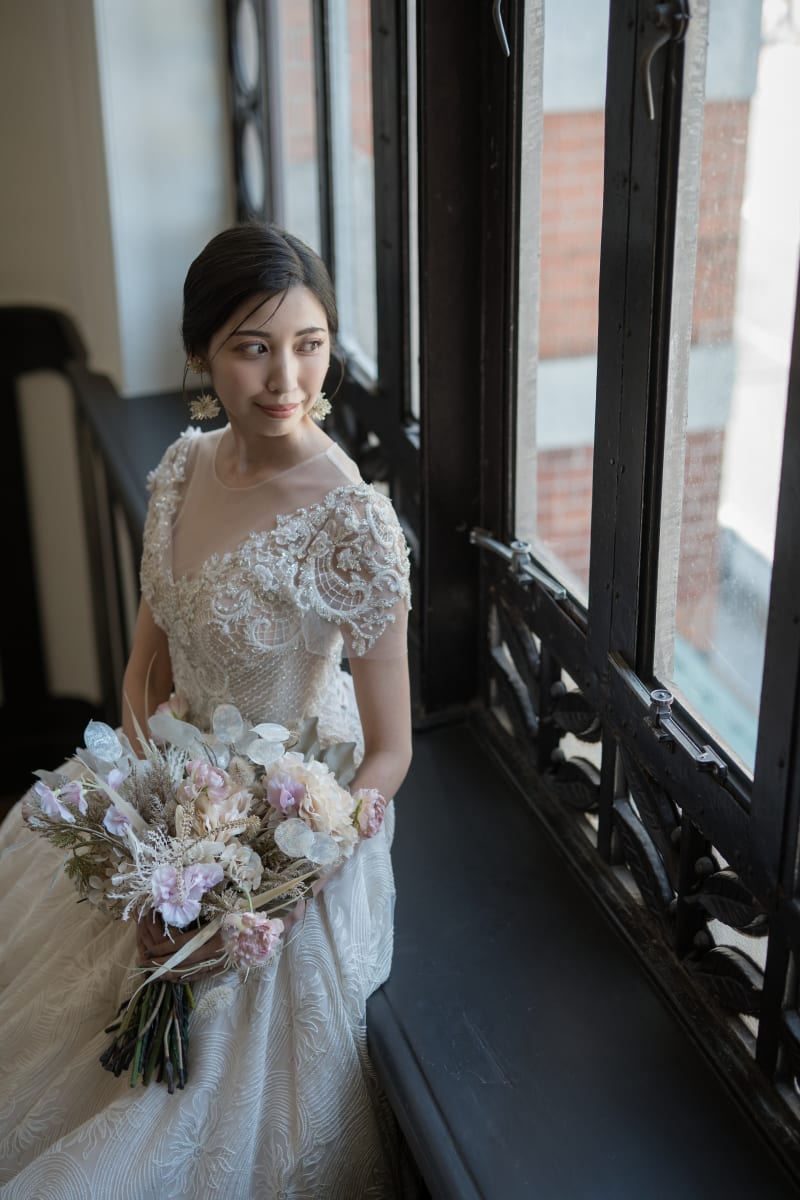 赤レンガの外観、ステンドグラスの光、重厚な雰囲気の中で、新郎新婦のお姿がまるで映画のワンシーンのように映える…そんな特別な一日でした。当日は雲ひとつない快晴。歴史ある開港記念会館の赤レンガが、青空にくっきりと映えて、ロケーションフォトにぴったりな一日でした。