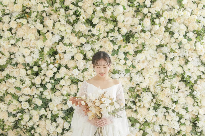 バラの壁に移動して新婦様のソロショット。お花畑のように華やかな印象になります。