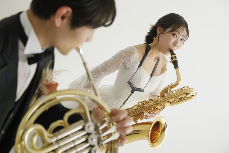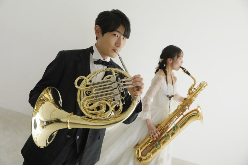 今回の撮影では、新婦様がサックスを、新郎様がホルンを持ち込んでくださいました。楽器はお二人にとても似合っており、ドレスとタキシードの華やかさをさらに引き立てていました。