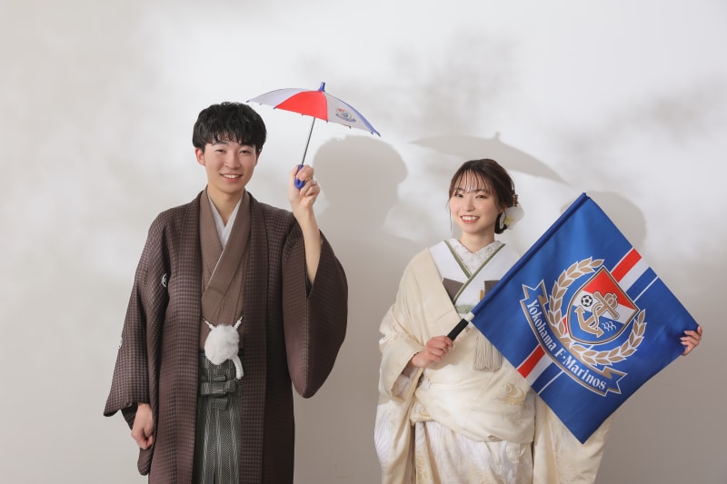 お二人の好きなサッカーチーム横浜F・マリノスのアイテムを使って撮影!