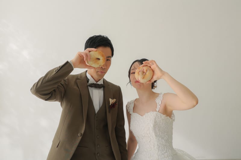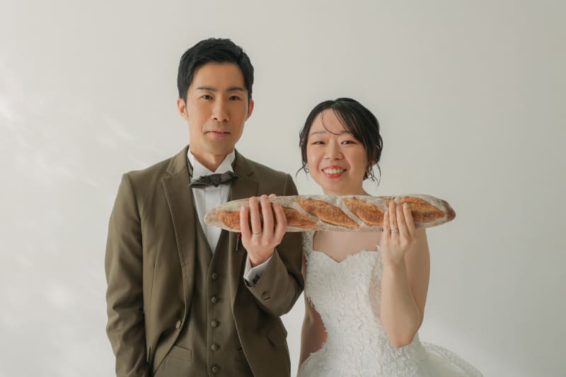 フランスパンを使って撮影!お二人でパンを指輪が見えるように持ってもらいました!