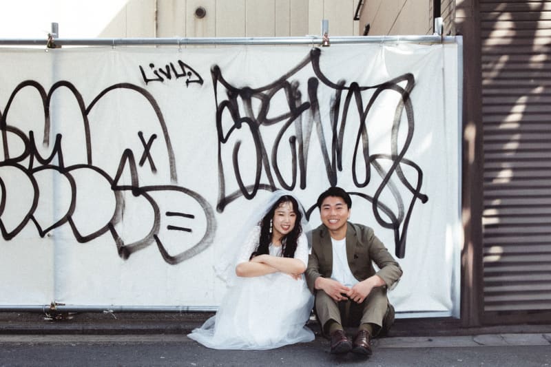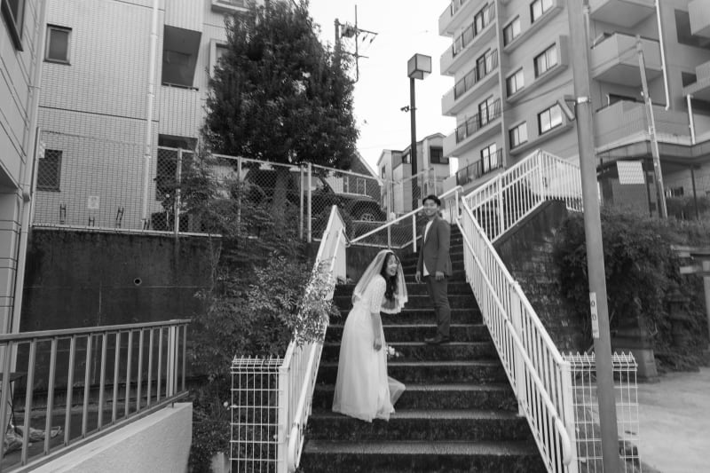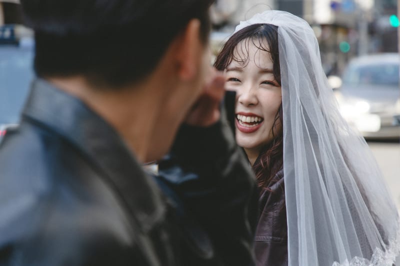 横浜みなとみらい店フォトグラファーの山村です。今回は街中で撮影した素敵なウェディングフォトの一日をご紹介します。横浜店にはあまりなかった野毛でのカジュアルなストリートフォトで、街をぶらぶら歩きながら良さそうなスポットを探して撮影していきました^^衣装もシャツではなくTシャツを着たり、ドレスやタキシードの上から革のジャケットを羽織ってみたりとお二人らしい撮影ができましたね!新郎新婦のお二人はとても明るく、最初から最後まで笑顔が絶えない心温まる撮影となりました。